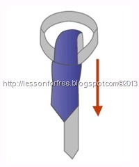 Wrap the wide end above, pull it up between the tie and collar. Then pull it down to the front. This forms the V of the knot.